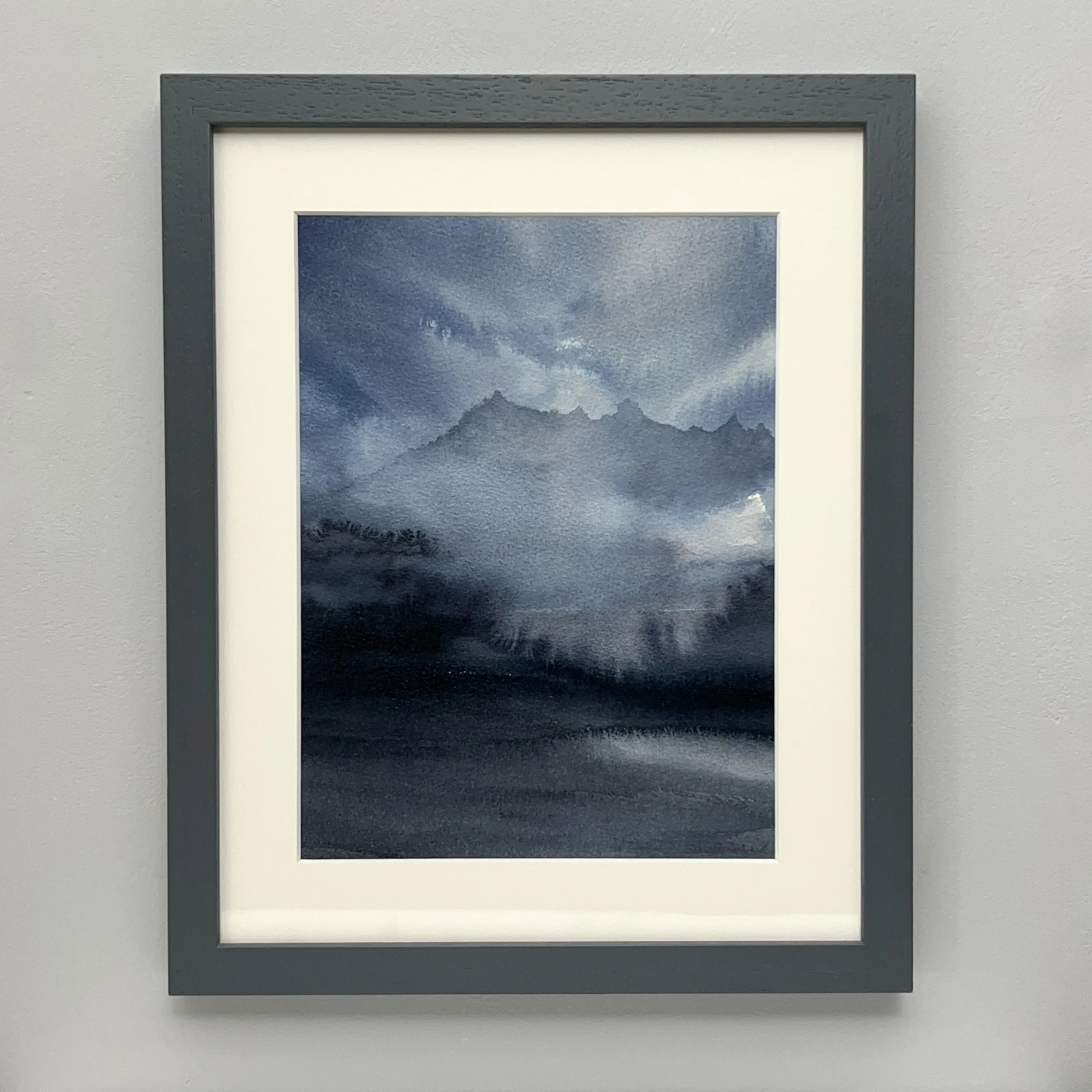 The title “Payne’s Grey Range” carries a layered meaning. It is inspired by the rich blue-grey pigment named after 18th-century English painter William Payne, while also reflecting the use of the pigment's full tonal spectrum (or range)— from delicate light washes to deep, dramatic shadows. Furthermore, the title references the mountain range and the varying weather, from mist to clouds.