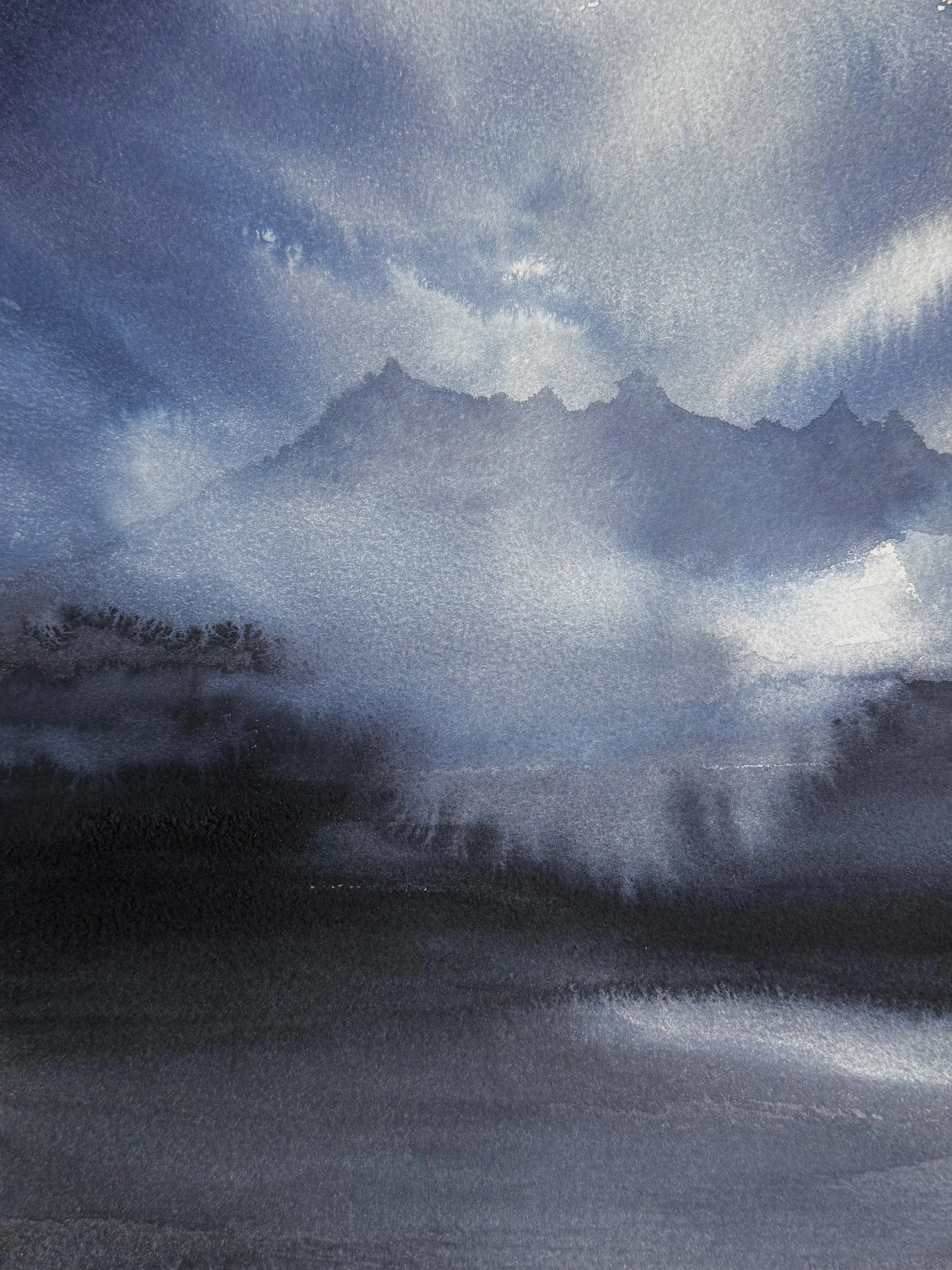 This watercolour blends realistic and semi-abstract elements creating a mysterious atmosphere and leaving room for interpretation. Shades of blue and grey depict a misty mountain range, with soft, diffused light breaking through rugged clouds above. It could represent a peaceful dawn, the clearing of a storm, or something more otherworldly.