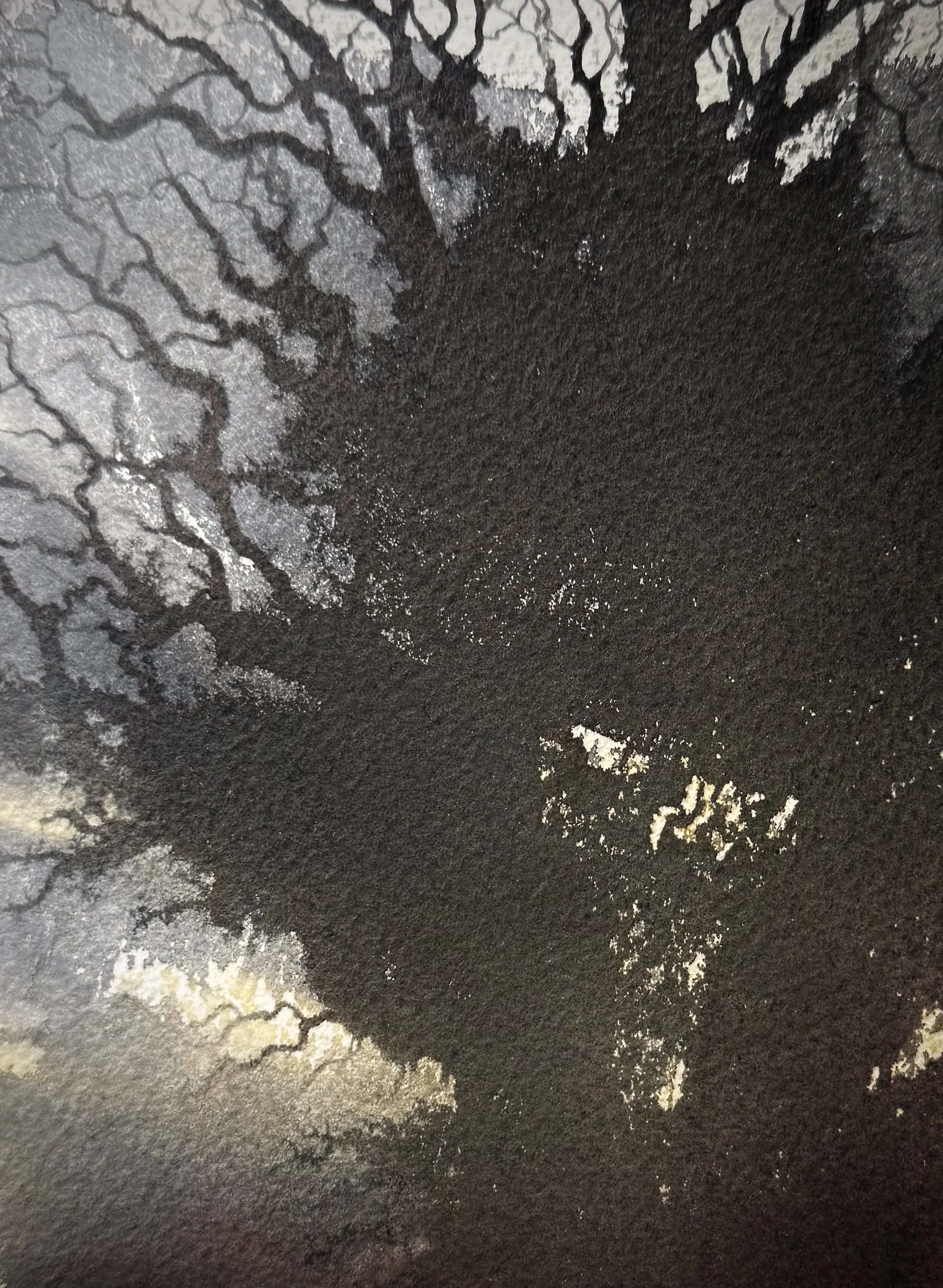 The painting’s moody atmosphere reflects my fascination with the eerie and the spooky, capturing the essence of Halloween and classic horror. It was loosely inspired by photographs I took in a local London park. A friend remarked that the mood reminded her of Bram Stoker’s “Dracula”.